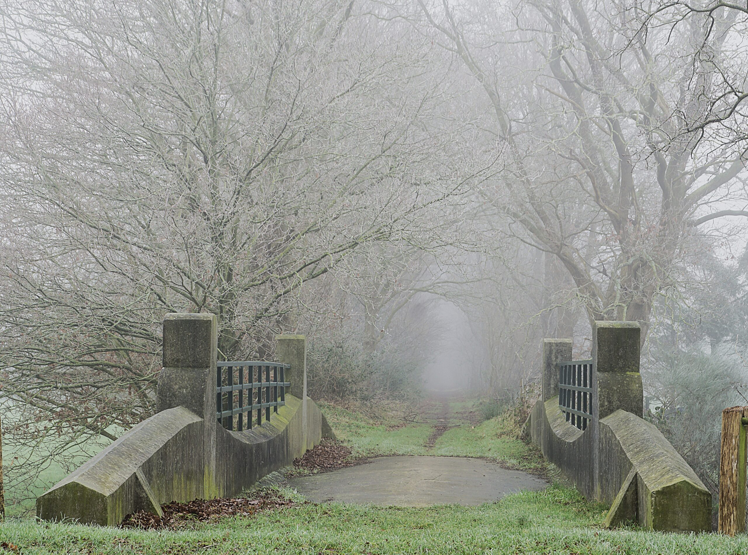 Mist zorgt voor een kleine wereld bij de oude trambrug in Hoornsterzwaag, een betonbrug uit circa 1935.